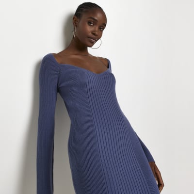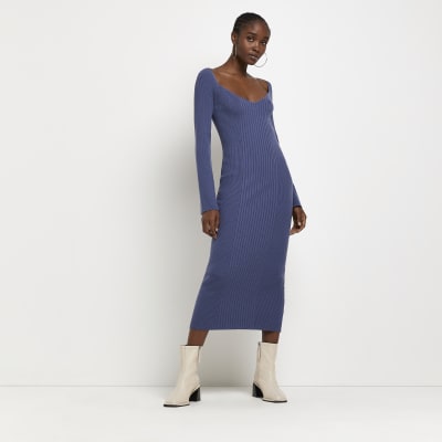 Navy Long Sleeve Bodycon Midi Dress River Island